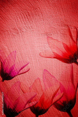 Obraz premium Grain red paint wall background and tulips