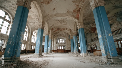 Naklejka premium Grand Abandoned Hall with Arched Windows and Ornate Columns, showcasing decay...