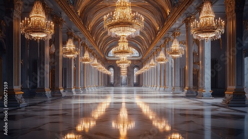 Fototapeta premium Grand ballroom with marble floor, ornate columns, and crystal chandeliers.