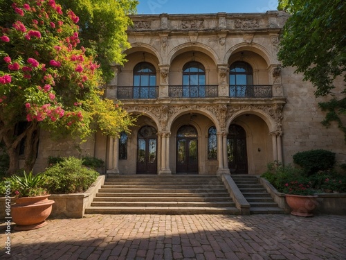 © Tamazina, Fototapeta premium Grand building features symmetrical facade with three large, arched doorways on ground floor, corresponding arched windows above, each framed by intricate stone carvings.