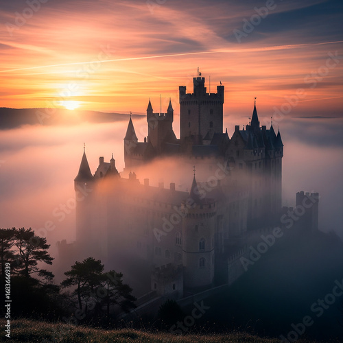 © felipetomas, Fototapeta premium Grand Castle Overlooking a Misty Valley