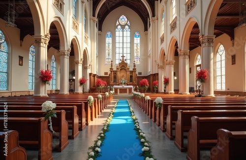 © Viktor, Fototapeta premium Grand church nave set for wedding ceremony. Blue carpet aisle lined with white flowers leads to altar. Red floral arrangements accent pillars. Sunlight streams through stained glass windows.