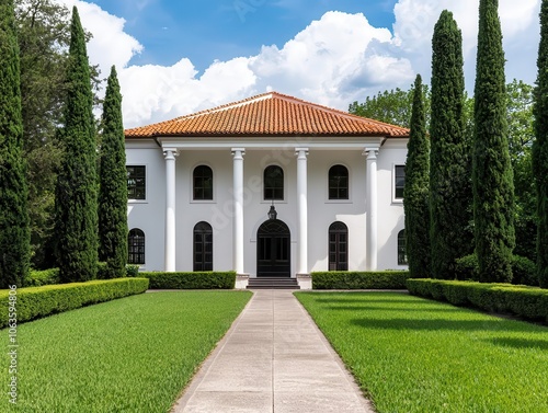 © Green Creator, Naklejka premium Grand colonial house under tall cypress trees, lush yard, traditional elegance