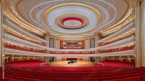 © SAQUEEN, Obraz premium Grand concert hall interior with red seats, a stage, and a piano.