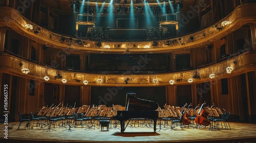 Obraz premium Grand Concert Hall with Orchestra Setup and Grand Piano on Stage