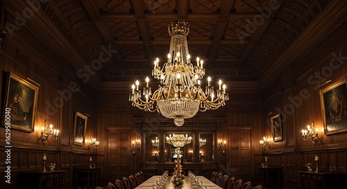 © Sulis, Obraz premium Grand Crystal Chandelier Illuminates Formal Dining Room