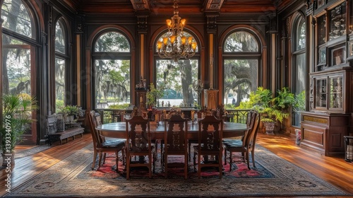 © Ika, Fototapeta premium Grand dining room with ornate details, overlooking a serene landscape