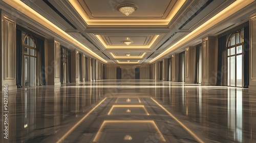 © ZUBI CREATIONS, Fototapeta premium Grand Empty Banquet Hall with Reflective Marble Surfaces, Elegant Lighting, and High Ceilings