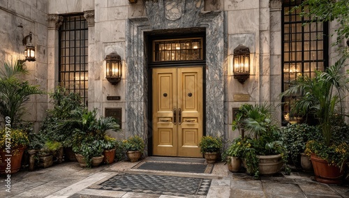 © Dev, Naklejka premium Grand entrance of a building, with gold doors, stone facade, and potted plants