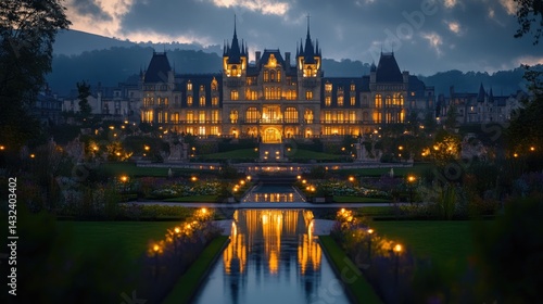 © Arvi, Fototapeta premium Grand estate at twilight. Illuminated palace with formal gardens reflected in water