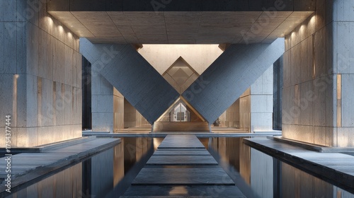 Fototapeta premium Grand Geometric Architectural Entrance with Reflecting Pool and Concrete Walls