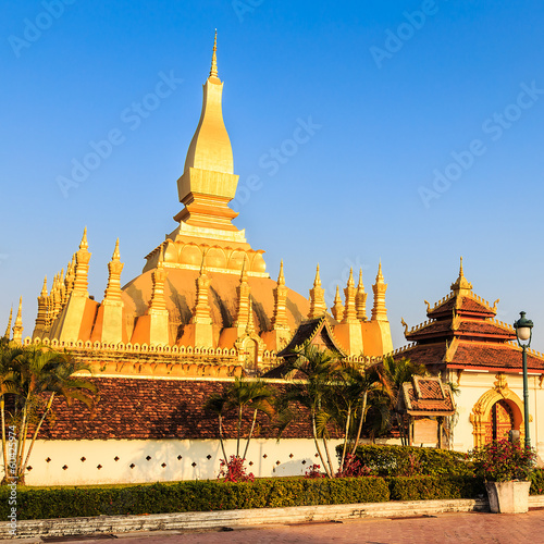 © paahboobkk, Naklejka premium Grand Golden Stupa with Blue Sky before Sunset, Laos