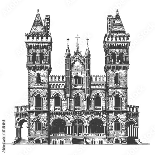 © NikahGeh, Fototapeta premium Grand Gothic Style Mansion Architectural Drawing
