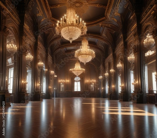 © Prasert, Obraz premium Grand hall with gleaming chandeliers and ornate details, stately, ornate, rich