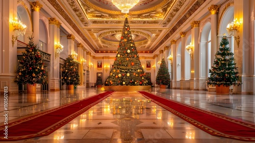 Obraz premium Grand hall with large decorated Christmas tree and red carpet.