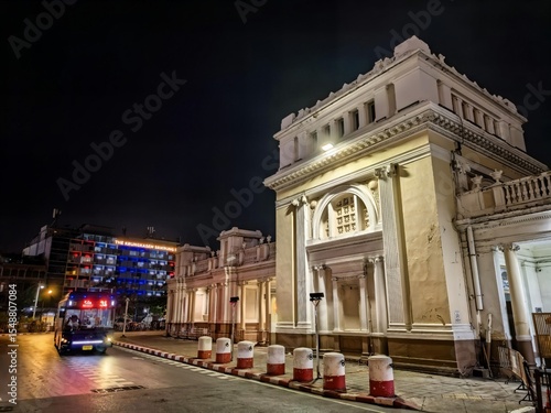 © Thanakrit, Fototapeta premium Grand historic building at night with a bus passing by in Bangkok