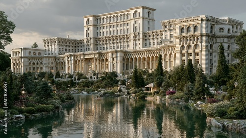 © Paul, Fototapeta premium Grand Historic Palace with Ornate Architecture Surrounded by Gardens and Water Reflection