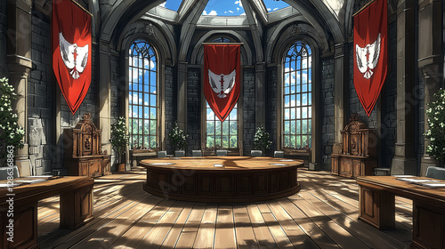 © Bitterblack, Fototapeta premium Grand interior of a majestic hall with tall windows, banners, and wooden furniture featuring a round conference table surrounded by elegant decor