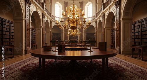 Fototapeta premium Grand Library Interior With Ornate Architecture, Books And Elegant Lighting...