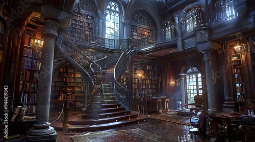 © Infinity, Obraz premium Grand Library Interior with Spiral Staircase and Ornate Details
