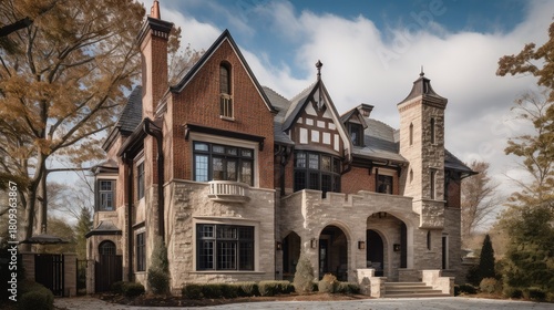 © Genji_Sova, Fototapeta premium Grand Luxury Estate House Featuring Traditional Brick and Stone Architecture under Blue Sky