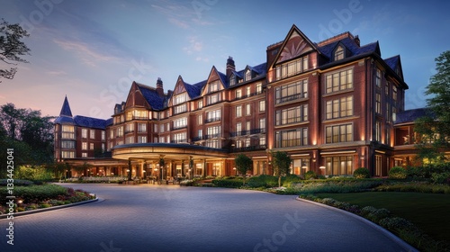 Naklejka premium Grand luxury hotel exterior with a sophisticated driveway, warm lighting, and...