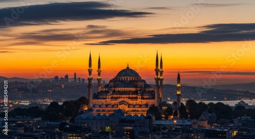 © ekalaila, Obraz premium Grand Mosque Illuminated at Sunset over Cityscape