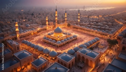 Fototapeta premium Grand Mosque Illuminated Night Aerial View Golden Domes Cityscape