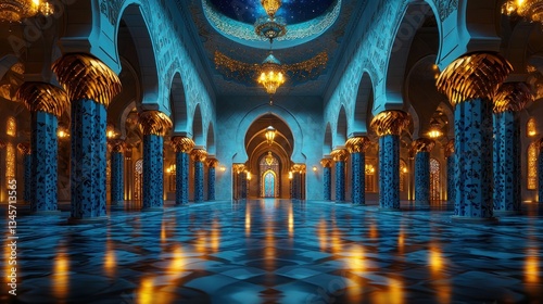 Obraz premium Grand Mosque Interior, Night, Blue Tiles, Golden Pillars