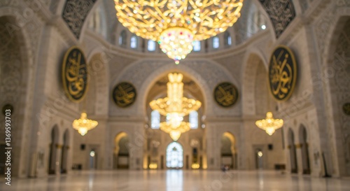 © ThanhLuan, Obraz premium Grand Mosque Interior Warm Light Gleaming Chandeliers. AI Generated