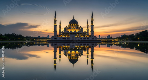 © Graphics, Fototapeta premium Grand mosque reflected in lake at sunset