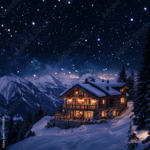 © Sekai, Fototapeta premium Grand Mountain Chalet Under a Starry Night Sky