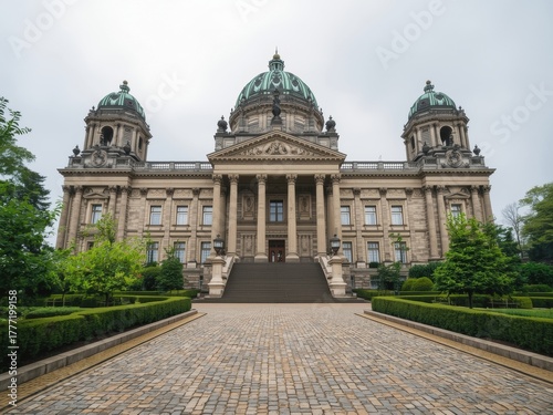 © Oisi, Obraz premium Grand neoclassical building with domes and manicured gardens under a cloudy sky
