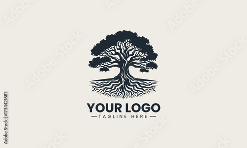 © DEFRIDA, Fototapeta premium Grand Oak Tree Roots vector logo illustration