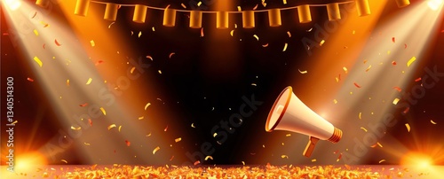 © Govindan maruthai, Naklejka premium Grand Opening Event Invitation Banner Megaphone, Loudspeaker & Confetti -Ideal for Business Marketing, Website & Print Advertising.