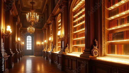 Fototapeta premium Grand Opulent Library Interior with Golden Lighting and Intricate Details