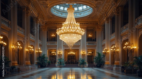 Obraz premium Grand opulent palace interior with massive crystal chandelier, marble floor,...