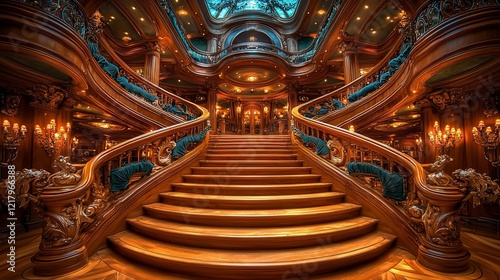 Obraz premium Grand opulent wooden staircase in a luxurious palace.