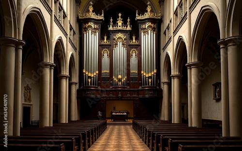 © li, Fototapeta premium Grand Organ with Gold Accents in Dark Gothic Cathedral. High quality
