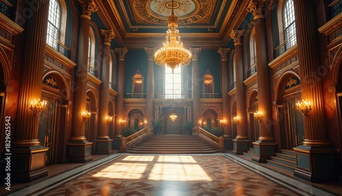 © Pete, Fototapeta premium Grand ornate ballroom with high ceiling, crystal chandelier. Luxurious palace interior classical columns, rich wooden floor. Sunlight shines through tall window, illuminating elegant empty hall.