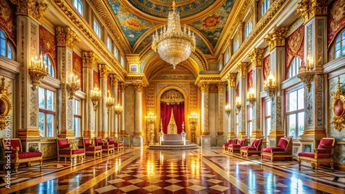© Four888, Obraz premium Grand Palace Hall: Panoramic View of Golden Throne Room with Marble Columns and Arch Windows