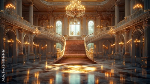 © Ali, Obraz premium Grand palace, opulent staircase, golden details.