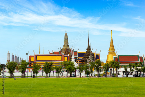 Naklejka premium Grand Palace with green grass and blue sky in Bangkok Thailand