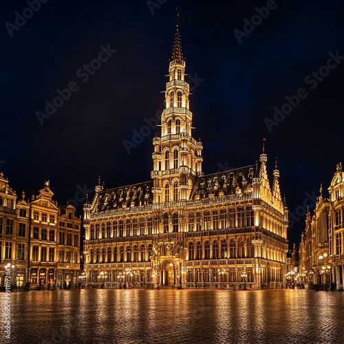 © สมชัย ้พาลแก้ว, Fototapeta premium Grand Place square in Brussels with night lighting, illuminated facades, Belgium. The main attraction of Brussels at night. Brussels Town Hall, City Museum
