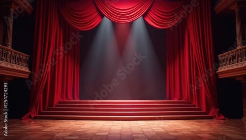 Fototapeta premium Grand red curtains, empty stage, ornate staircase bathed in spotlight , theater, design, luxury
