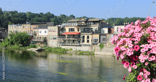 © Harold Stiver, Fototapeta premium Grand River in Paris, Canada with flowers in front