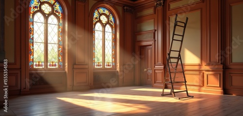 Fototapeta premium Grand room interior with sunlight through stained glass windows. Wooden ladder stands near door. Staging new home, design, renovation, remodel repair. Bright apartment property, residence, building.