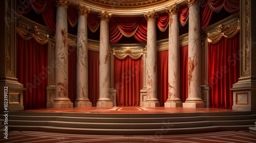 Obraz premium Grand stage with red curtains and marble columns.