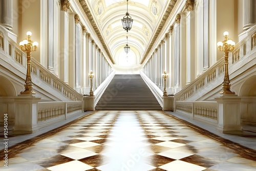 Obraz premium Grand Staircase with Checkered Floor and Golden Railings in a Palace