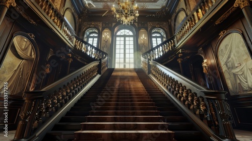 © NurUl, Obraz premium Grand Staircase with Ornate Railings and Chandelier in Luxurious Interior Perfect for Luxury